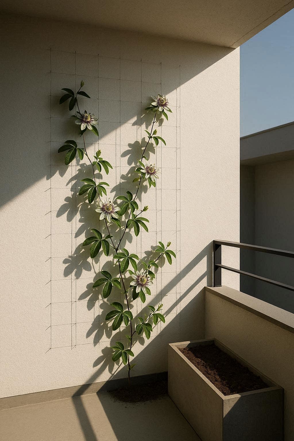 Mount a PVC pipe grid or fishing line trellis on the back wall directly facing the balcony door — the first thing you see when you step outside. Train a single, spectacular climber such as a passion flower or climbing rose as the centrepiece of the entire balcony display.