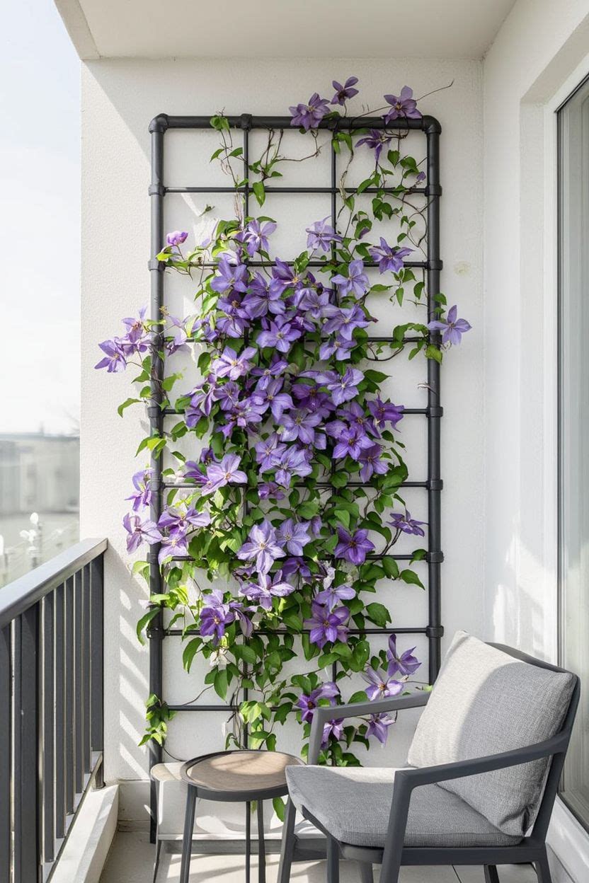 💡 Design tip: A single large-flowered clematis trained against a white wall on a fishing line trellis is one of the most photographed and pinned balcony garden images in existence. Simple, dramatic and stunning.