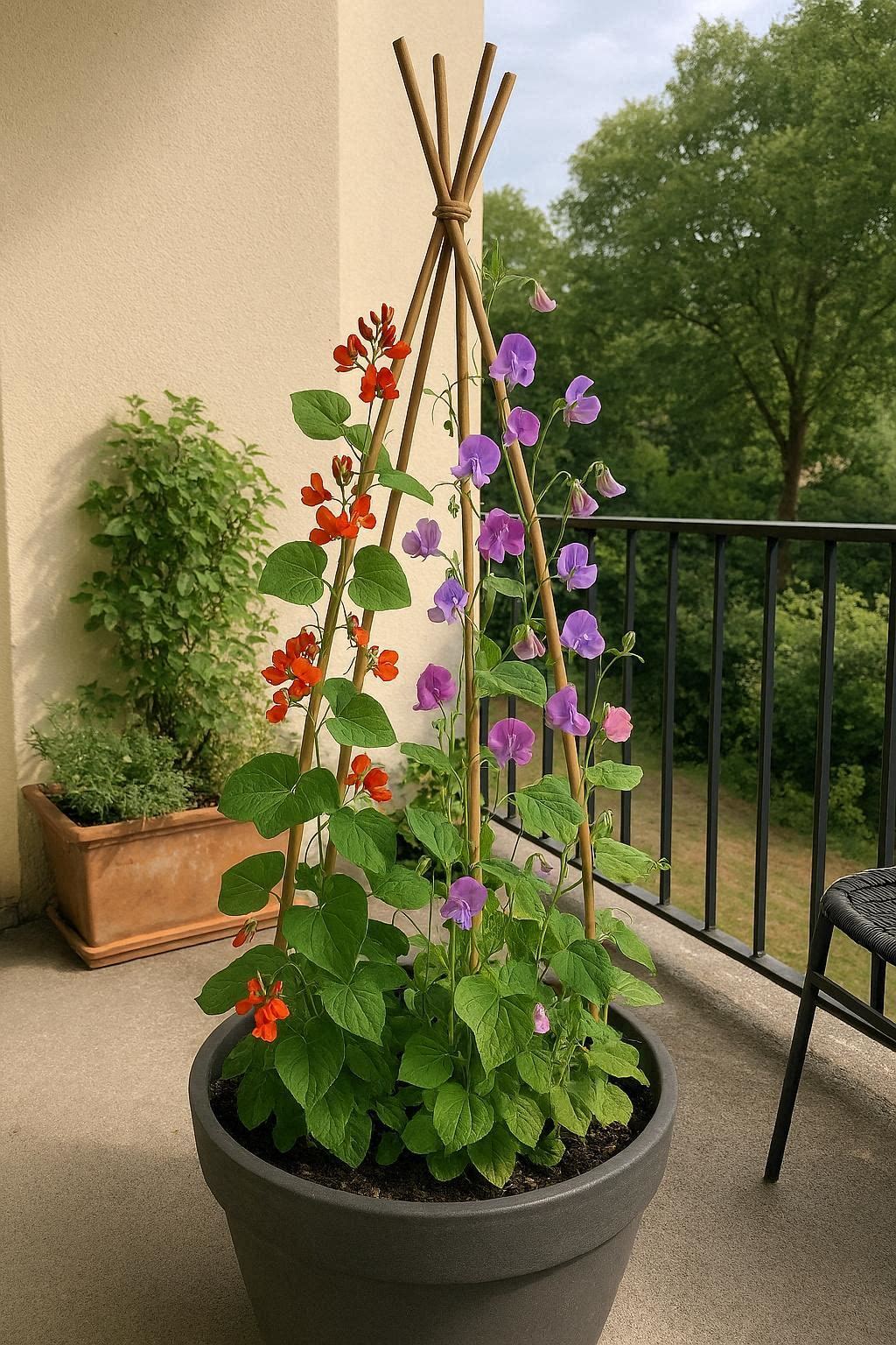 📌 Pinterest Hook: “Grew beans AND flowers on my tiny balcony with a $8 teepee trellis 🫘🌸”